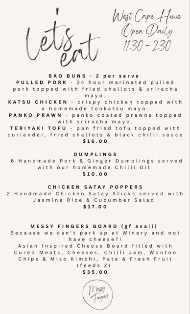 We’re excited to now offer food from Messy Fingers — serving a bold, Asian-inspired menu from our cellar door kitchen, daily from 11:30am to 2:30pm.